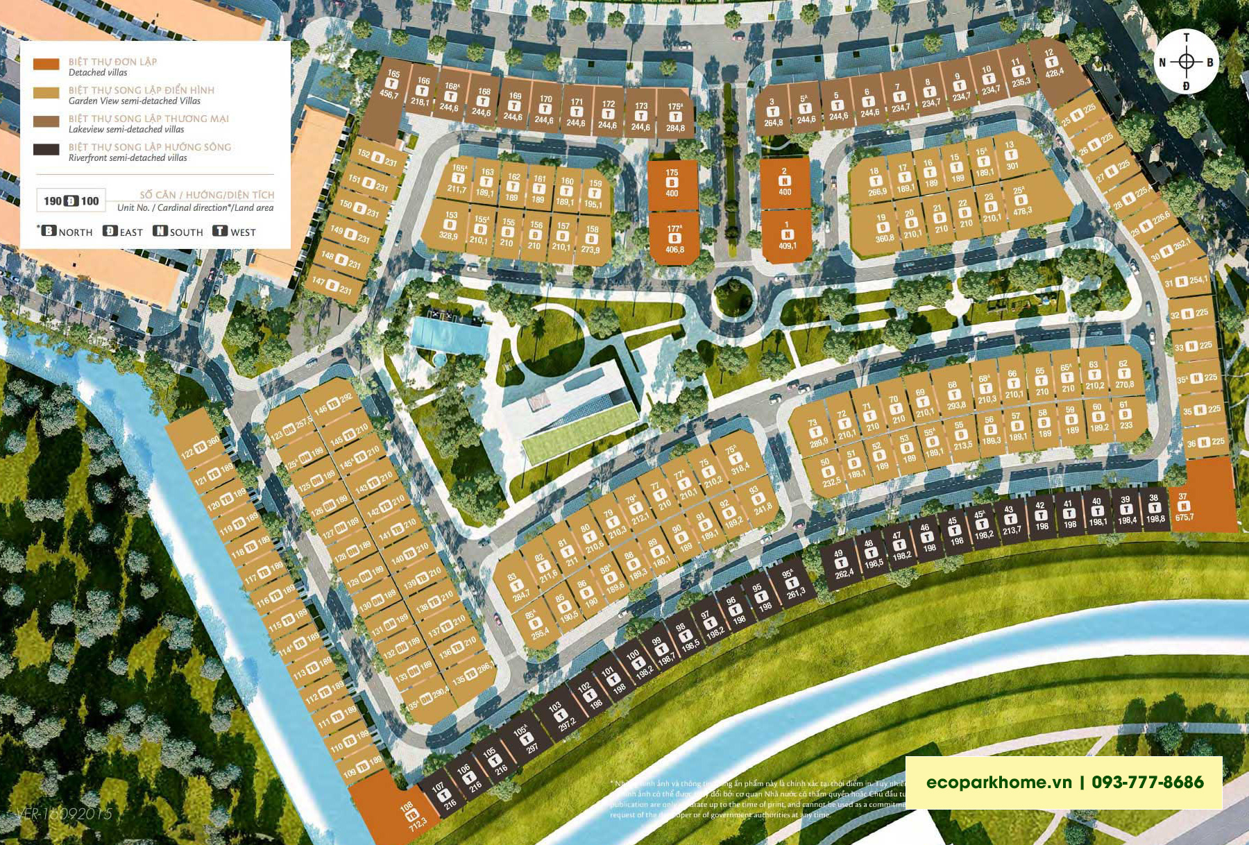 - Biệt thự song lập hướng sông: 26 căn, diện tích 189-297m2